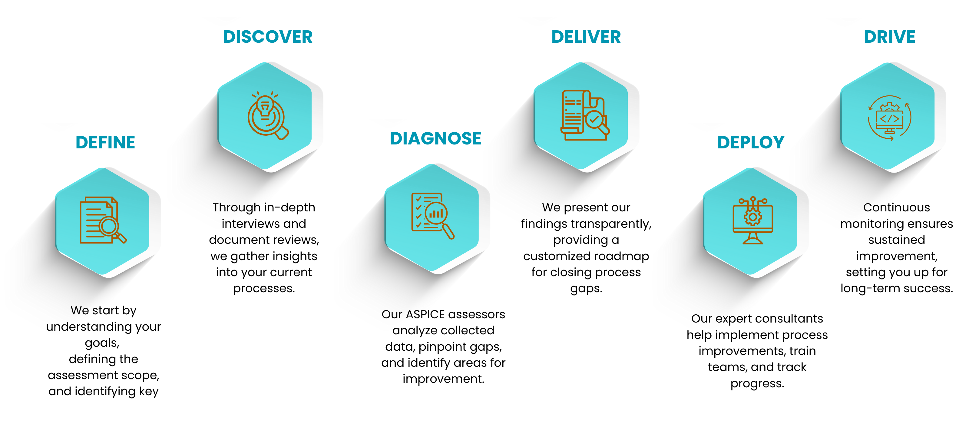Our seasoned ASPICE principal assessors and ASPICE provisional assessors meticulously evaluate your existing procedures, identifying key gaps and opportunities. With our 6D Framework, we don’t just assess; we guide you every step of the way toward lasting improvement.